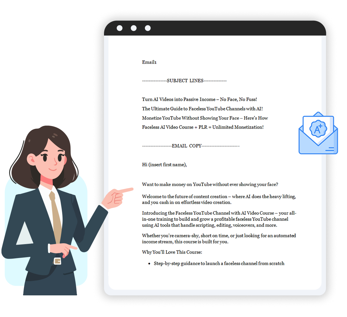 This comprehensive package features a video training course, an AI-powered content guide, customizable sales materials, and exclusive bonuses—including a checklist, mind map, and expert monetization strategies—to accelerate your success.